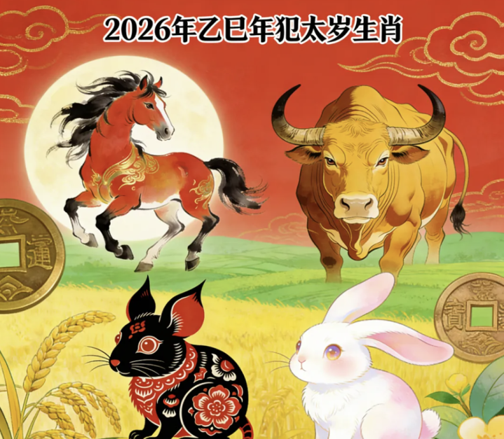 2026年是丙午马年,犯太岁的生肖有: 1.马,本命年和午午刑太岁。 2.鼠,子午冲太岁。 3.牛,午丑穿太岁。 {jz:field.toptypename/} 4.兔,午卯破太岁。 最初要明晰什么是太岁:太岁实验是古东说念主不雅测木星围绕地球,碰劲是十二年一个循环,字据木星与地球的角度,造成了十二地支,也即是十二生肖,搭配天干以阴阳分散为六十甲子,木星也即是岁星。六十甲子以六十位品德上流的历史东说念主物定名,省略说是由庶民念力假象是这位神帝王事,以求取得卵翼、平允、正义等等祈求,如2025年...