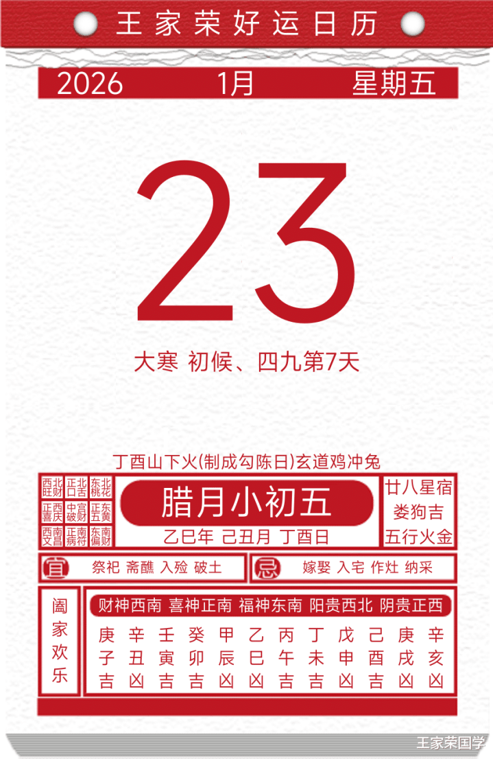 农历日历:二零二五 乙巳蛇年 腊月小初五 下一气节:立春 2,4,2026 所属季节:季冬 当天八字:乙巳 己丑 丁酉 庚子 时干:庚辛壬癸甲乙丙丁戊己庚辛 时支:子丑寅卯辰巳午未申酉戌亥 时吉:福祸吉福祸凶吉福祸福祸凶凶 生肖冲煞:鸡冲兔 当天星座:水瓶座 星次:玄枵 彭祖百忌:丁不剪发,酉不会客 十二值神:成,勾陈,玄说念日 逐日历本福祸宜忌2026年1月23日 廿八星宿:娄金狗 {jz:field.toptypename/} 当天三合:牛,蛇 当天宇宙:龙 当天五行:天干丁属火,地亲属金...