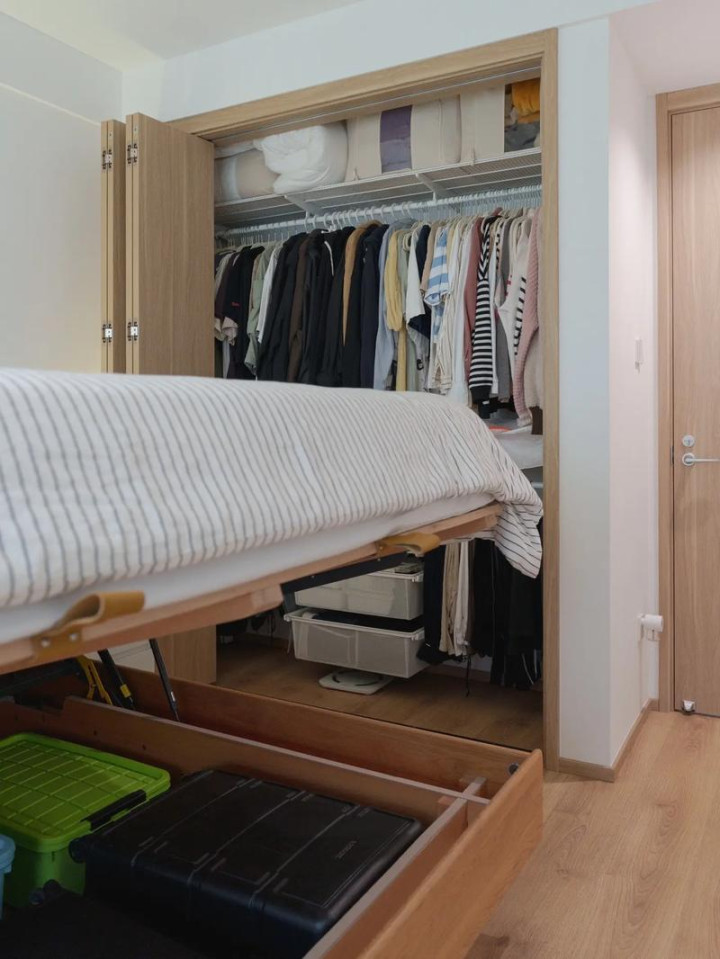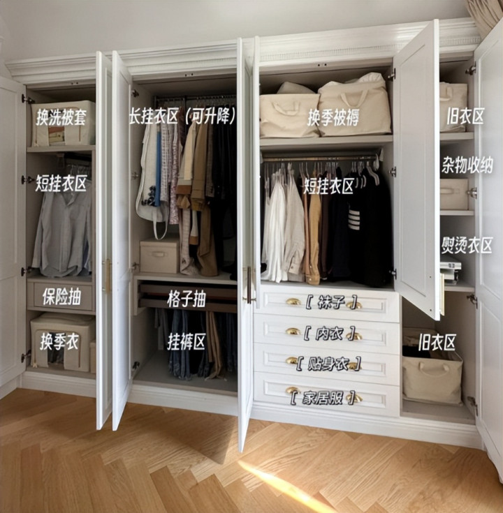 别忘了“黄金高度”:常用区域成立在抬手约略到的位置,过季物品或被子放在最高处,底部可计算大抽屉收纳重物。