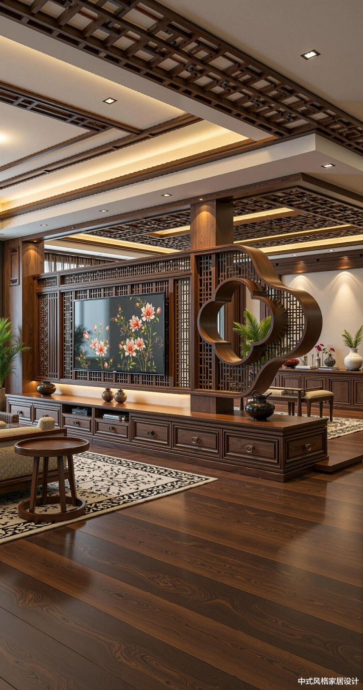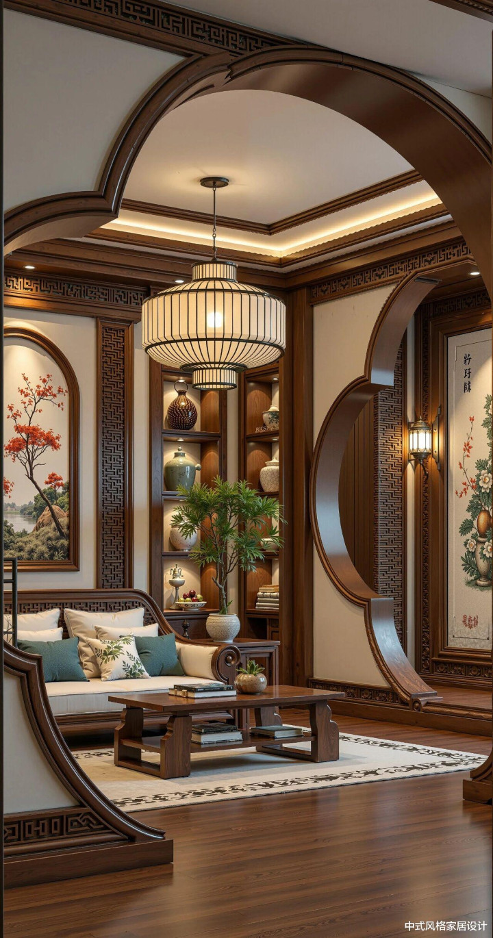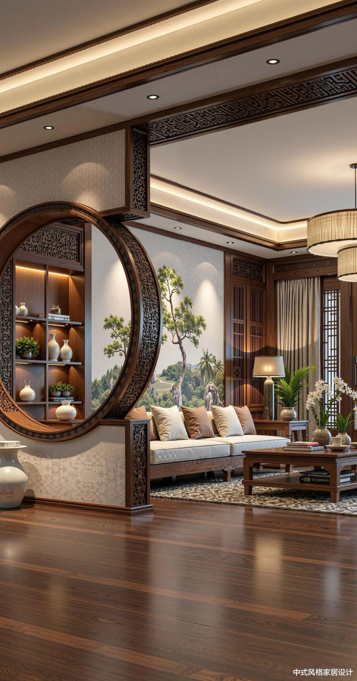 推开镂空雕花的木门,登第客厅的温润气味扑面而来。深棕色实木地板上,圆形镂空屏风如新月横亘中央,屏风后木质博古架陈设青瓷瓶与陶罐,架上水墨花草图以浓淡墨色勾画牡丹雍容。抬眼可见格栅吊顶,几何纹路与讳饰灯带交汇,光影在太师椅与八仙桌间流转,尽较着清居品的千里稳气韵。米白与深棕相间的地毯铺展大地,绿植在边际舒展叶片,传统与当然在此和会。这方空间以木为骨、以艺为魂,是时光千里淀的东方好意思学。 顶部:深色木质格栅吊顶搭配讳饰灯带,光影档次分明。 禁绝与配景:镂空...