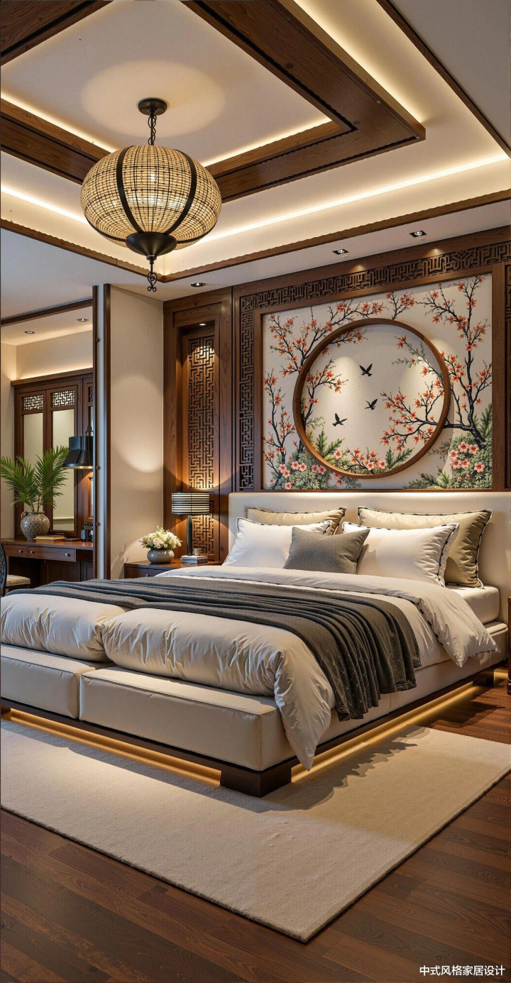 卧室全体计算合并传统韵味与现代快活感。以深棕色实木框架为基底,搭配米灰色软包床头与浅灰色床品,色调千里稳时髦。顶部双层石膏线吊顶镶嵌暖黄色灯带,搭配圆形竹编吊灯,光影柔软。床尾墙面吊挂圆形花鸟图,以红梅、飞鸟与翠竹为主题,色调明快;两侧木质镂空禁绝与镶嵌式壁灯对称散布,尽显登第对称好意思学。床头柜上青瓷花瓶与精雅花艺点缀,大地铺设米白色地毯,搭配深色实木地板,营造温润静谧的休憩氛围。