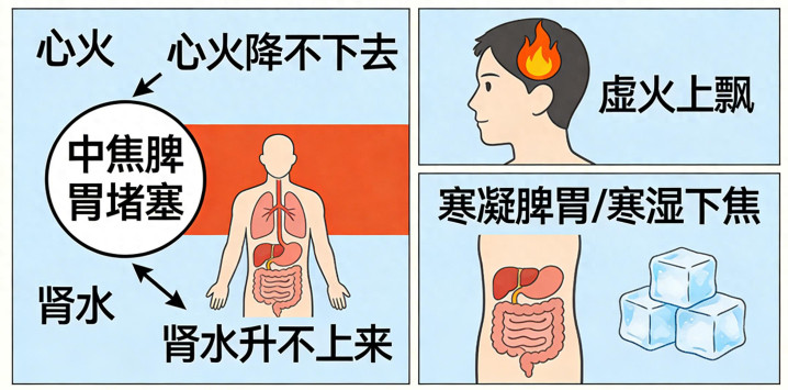 上头是飘着的虚火,底下是寒凝的脾胃,大概寒湿的下焦。