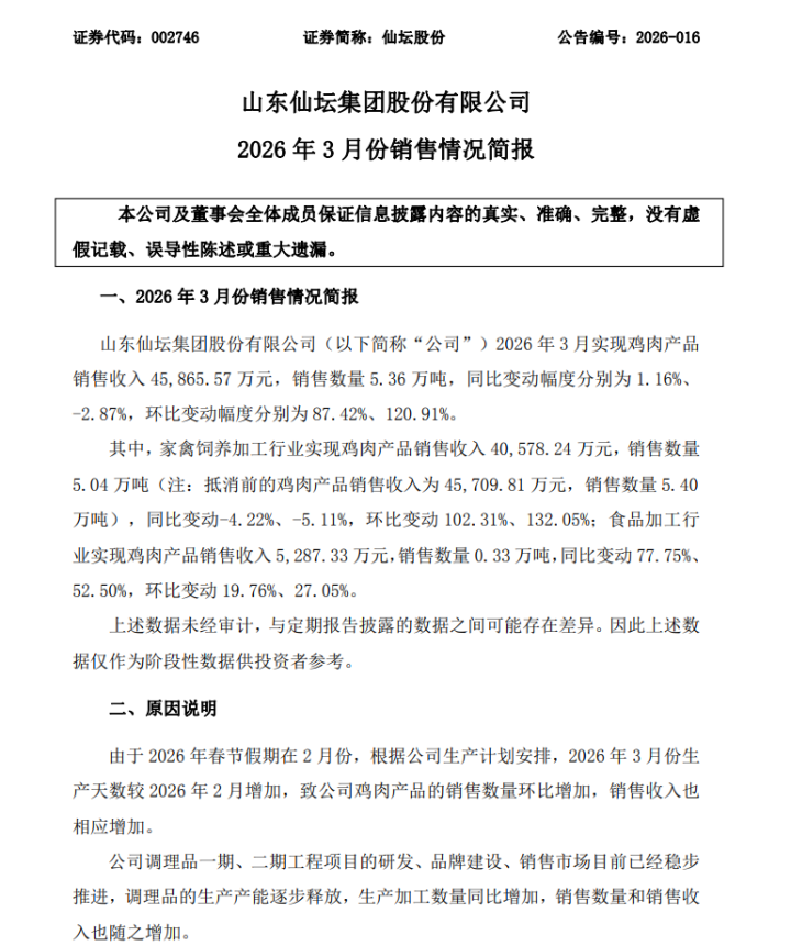 4月10日,仙坛股份(002746.SZ)发布了2026年3月份销售情况简报。