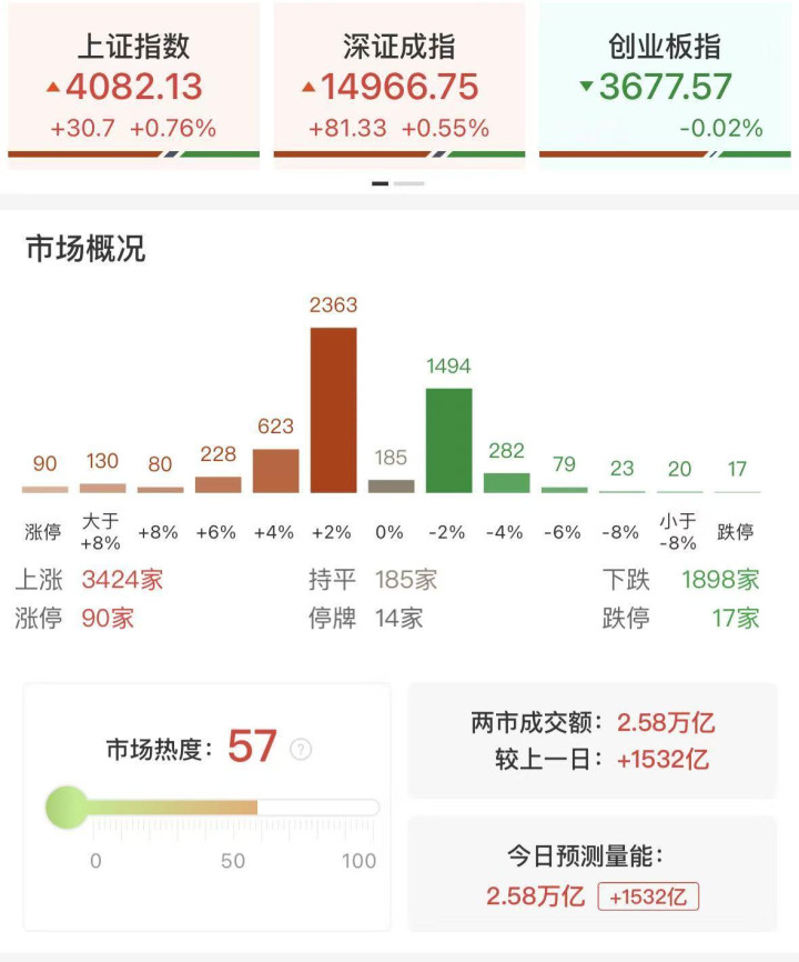 财联社4月20日讯,三大指数涨跌不一,沪指震撼拉升,创业板指冲高回落,科创50指数涨超1.5%。沪深两市成交额2.58万亿,较上一个往翌日放量1532亿。盘面上,阛阓热门快速轮动,全阛阓超3400只个股飞腾,其中90只个股涨停。从板块来看,交易航天观点爆发,十余只因素股涨停,神剑股份4天2板再创历史新高,中国卫通、中国卫星、西部材料、中衡设想涨停。光纤观点快速拉升,通鼎互联3天2板,中天科技涨停。液冷行状器观点走强,康盛股份7天4板,英维克波及涨停,创历史新高。下落方面,医药板块走势较弱,科拓生物、恩华药业、君实生物等纷繁下挫。适度收盘,沪指涨0.76%,深成指涨0.55%,创业板指跌0.02%。