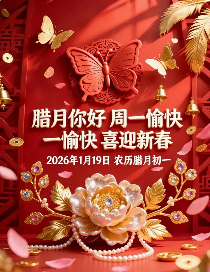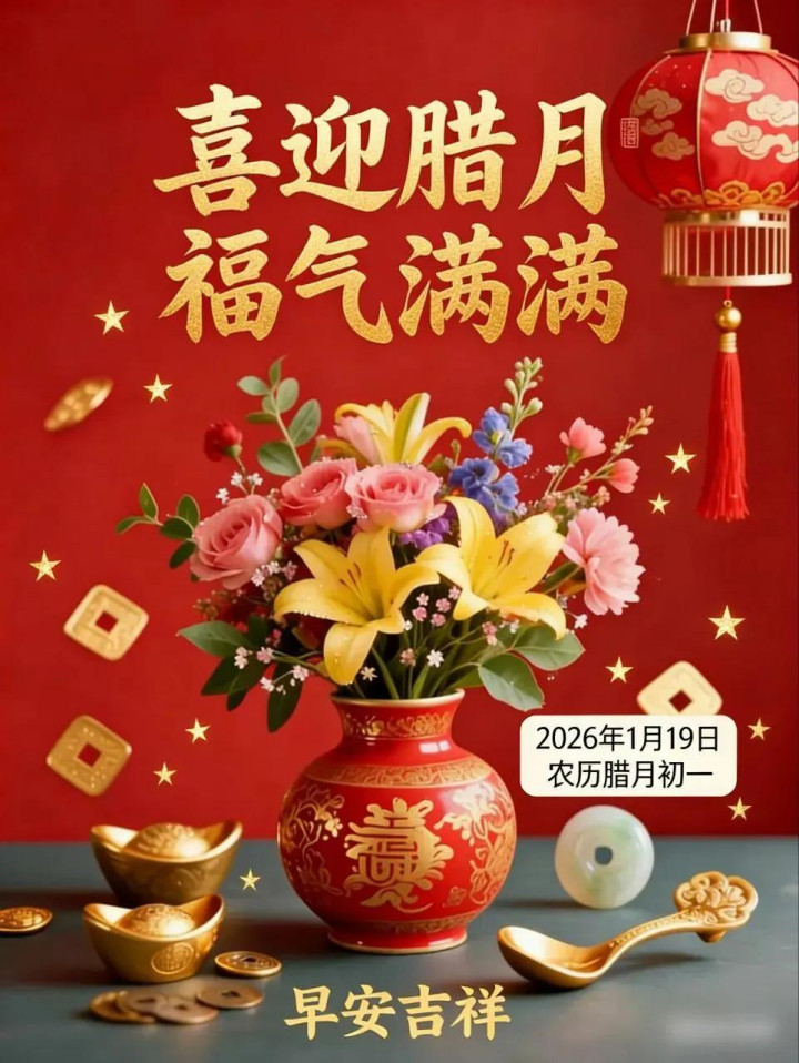 1月19日,星期一。今天是农历腊月的第一天,还有一个月就到春节了。耐得冬日严寒,终见春日似锦。愿您岁寒心暖,唾手安康。 腊月月吉好彩头,纳闷祛除无忧愁。腊月月吉好兆头,健康吉祥又长命。腊月月吉待骏首,福禄寿喜家中留。腊月月吉,开个好头。愿你管事告成,生涯无忧,好运加满,更进一竿。 腊月初开,好运来,祝你马年发大财。愿你农历临了一个月,喜事束缚,好运连连,隆运当头照,财路滔滔到,所求王人称愿,愿望都完满。 {jz:field.toptypename/}...
